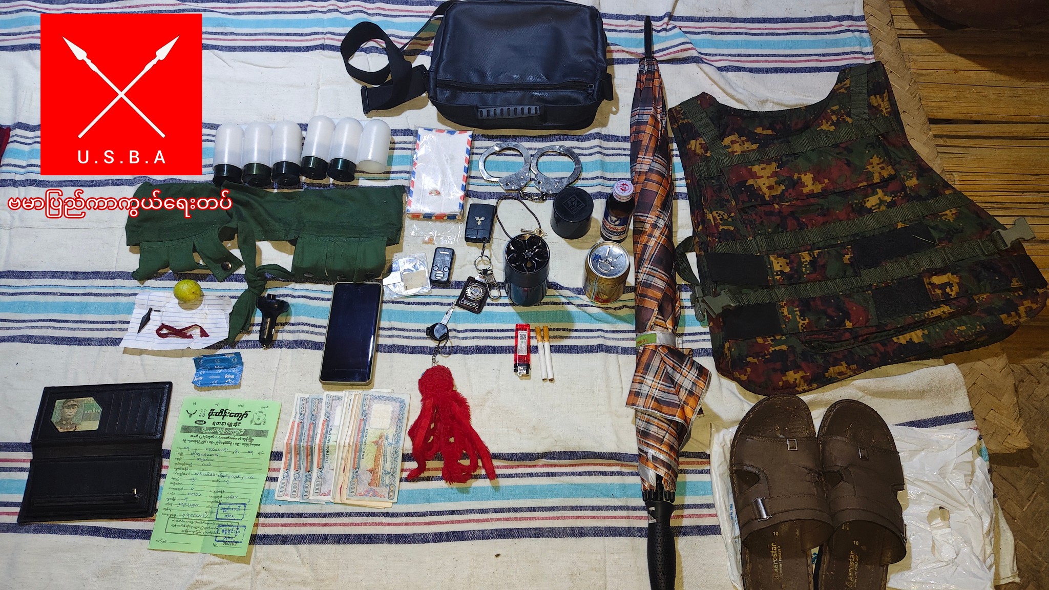 ထို့ကြောင့် အကြမ်းဖက်စစ်သားများ စီးနင်းလာသော အနက်ရောင် အိမ်စီးကား ၁ စီး ၊ ၄၀ မမ ဗုံးသီး ၅ လုံး Euip ၁ စုံ ၊ ဖုန်း ၁ လုံး ၊ ပိုက်ဆံအိတ် ၁ လုံး ၊ ပိုက်ဆံ ၂ သိန်း ၆ သောင်း ကျပ် ၊ လက်ထိပ် ၁ စုံ ၊ ဖိနပ် ၁ ရံ ၊ ထီး ၁ ချောင်း ၊ ဘေးလွယ်အိတ် ၁ လုံး ၊ အဆောာင်ယတြာ ၁ မျိုး ၊ ကွန်ဒုံး ၂ ခု ၊ ရွှေ ၀ယ် ယူထားသော ပြေစာ ၁ ခု ၊ သံပုရာသီး ၁ လုံး ၊ အား သွင်း ခေါင်း ၁ ခု ၊ ဆိုင်ကယ်သော့ ၁ ချောင်း ၊ Ruby ဆေးလိပ် ၂ လိပ်၊ မီးခြစ် ၁ လုံး ၊ စာအိတ် အ လွတ် ၂၃ လုံး ၊ ကားရေမွှေး ၁ ပုလင်း နှင့် အချိုရည် ၂ ဗူး တို့ကို သိမ်းဆည်းရရှိခဲ့ကြောင်း သိရသည်။